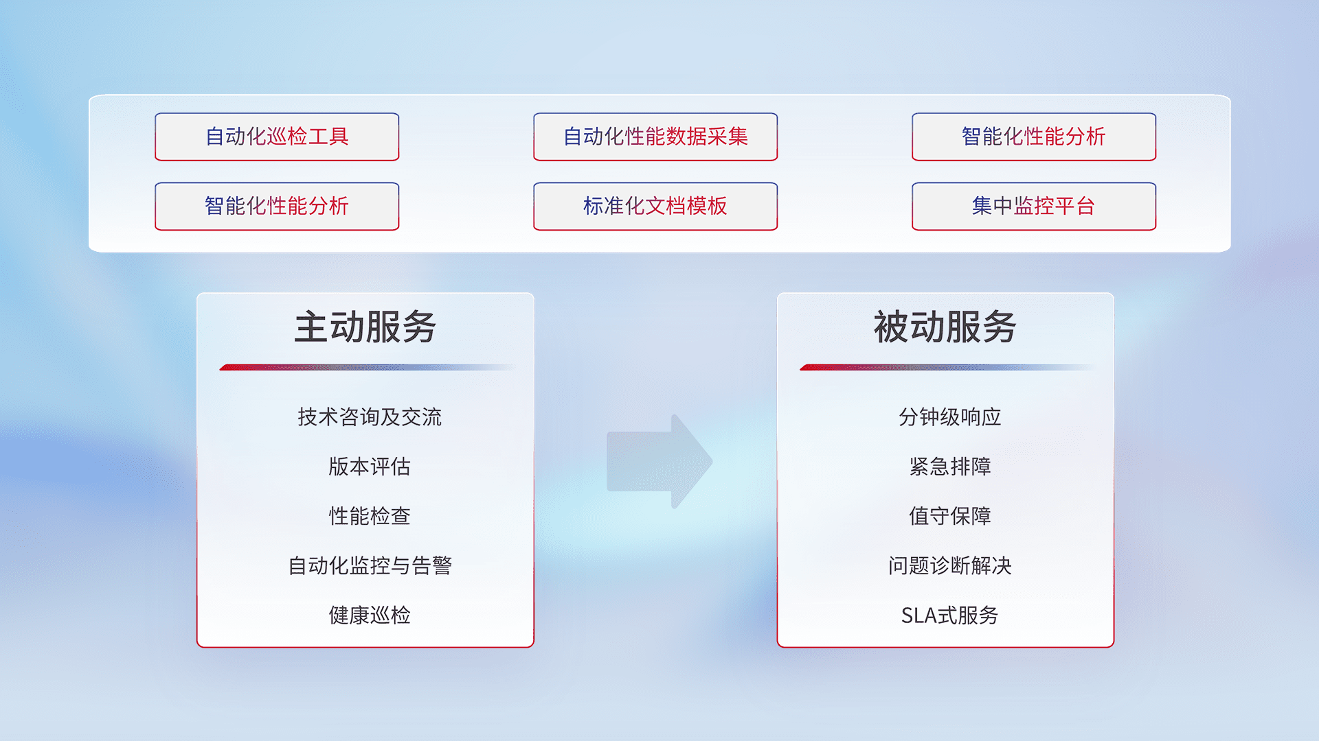 智能化工具和标准化文档,,保障服务质量,,提供主动服务(包含技术咨询、、、版本评估、、、、性能检查、、自动化监控与告警、、健康巡检)和被动服务包含(分钟级响应、、、紧急排障、、、值守保障、、、、问题诊断解决、、、、SLA服务)。。。。